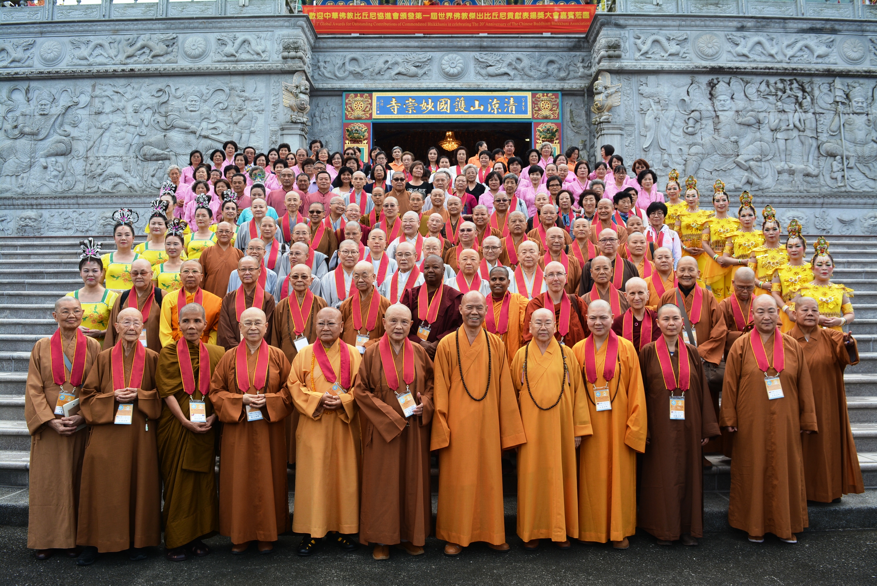 本會創會20週年頒發第一屆世界佛教傑出比丘尼貢獻表揚獎,由普暉理事長帶領國內外得獎人及所有隨行人員近110人參訪宏安副理事長之道場─六龜清涼山護國妙崇寺。