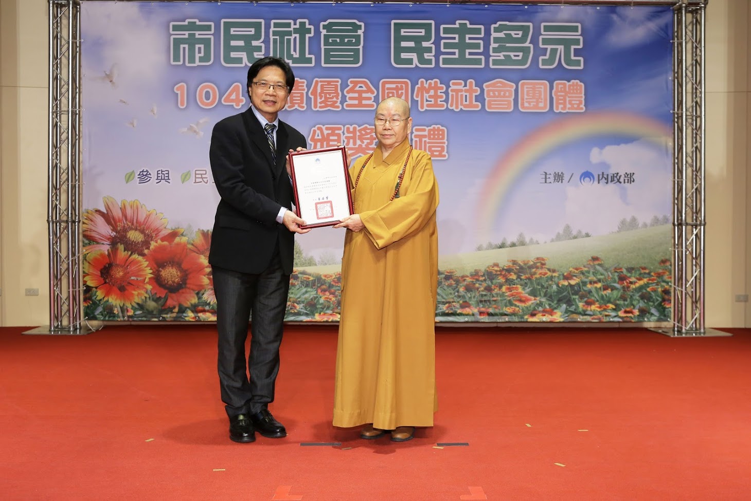 為促進社會團體健全發展,內政部假臺北市青少年發展處6樓國際會議廳舉辦『104年度績優全國性社會團體頒獎典禮』,本會榮獲評鑑甲等肯定,宏安副理事長代表本會前往受獎。